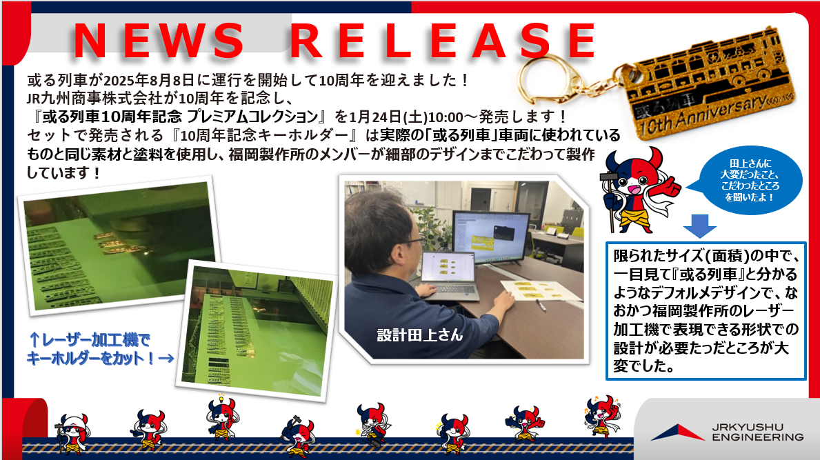 2026.01.16 或る列車【10周年記念キーホルダー】リリース! 発売開始日時・発売箇所について (1)予約受付 2026年1月24日(土)10:00~ (2)予約受付箇所 「九州の旅とお取り寄せ」内 https://www.jrk-kyushutabi.shop/shopdetail/000000010594 前の記事へ お知らせ一覧 次の記事へ